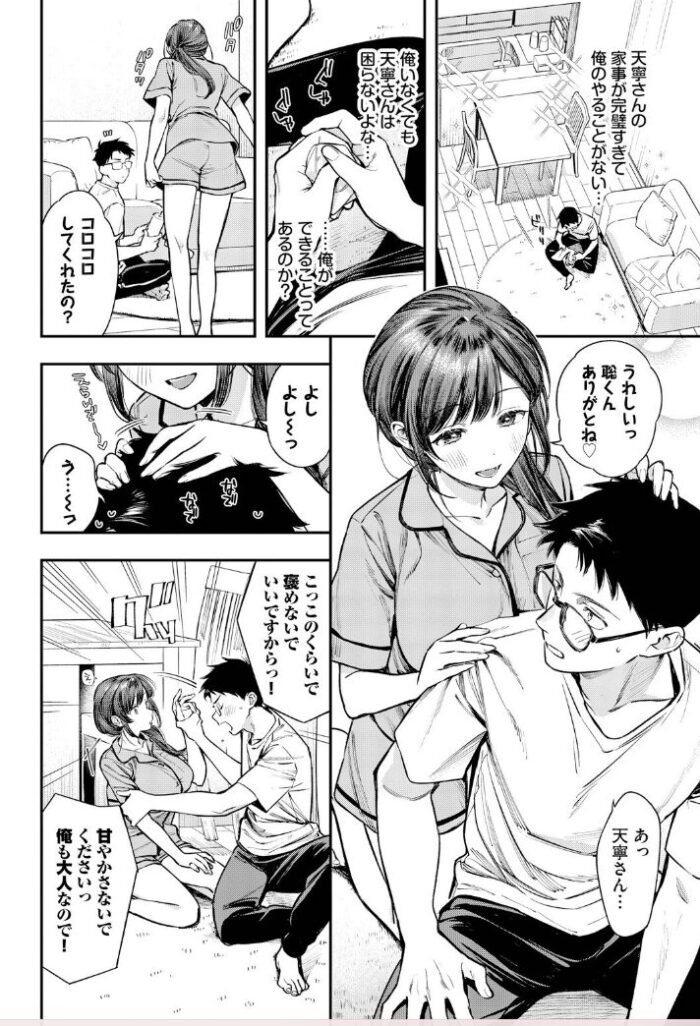 自分も頼られる人間になりたいと伝えると「じゃあ私のお願い聞いてくれる?」と言ってして膝枕をされ「聡君は今から赤ちゃんになって!」と授乳手コキが始まって…!?